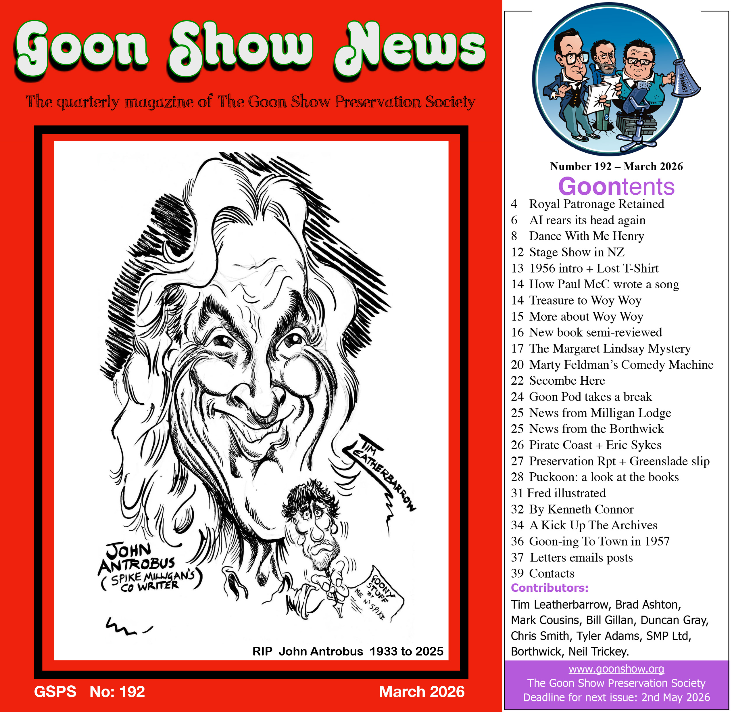 We highly recommend The weekly podcast aboutall things Goon related. | Items Wanted – Can You Help? The GSPS is looking for a number of recordings, cuttings and such to complete our archives. List here > The regular newsletter web links series – A Kick Up the Archives – is now on the website – read it here More of these and other articles are being added regularly. |