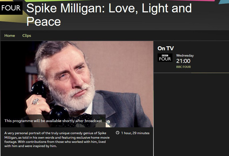After Spike Milligan: The Unseen Archive was broadcast on the Sky Arts channel last month, there’s another Spike documentary showing on TV this coming week. It’s on BBC4 this time and the programme is Spike Milligan: Love, Light and Peace, which is scheduled for Wednesday 11th January at 9pm. There’s also a repeat scheduled on the same channel on Sunday 15th at 1030pm.