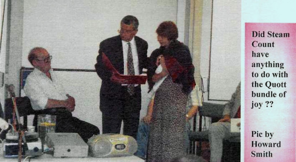 Steam Count Bill Horsman was the subject. Several dubious characters from Bill’s past were introduced including “Bruce”, “Molly Quotts” and her twin sister “Freda” who, cradling a bundle of joy, shyly admitted that she had last seen Bill nine months ago; the little bundle was unwrapped to reveal a large bottle of ‘Quick Round The Back For The Old’ brandy.