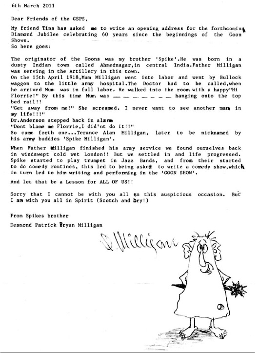 “Needless to say, I am incredibly sorry to be missing the 60th anniversary celebrations of The Goon Show, but what has alarmed me is to realize that I am actually older than the Show.