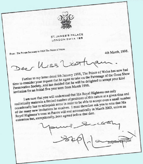 Since 1998, the Goon Show Preservation Society has been honoured and enjoyed the patronage which HRH Prince Charles bestowed on us. This reflected his personal support. It is well documented that His Majesty has been a lifelong aficionado of The Goon Show and a friend and admirer of the principal stars of the series, Sir Spike Milligan, Sir Harry Secombe, Peter Sellers and Michael Bentine.