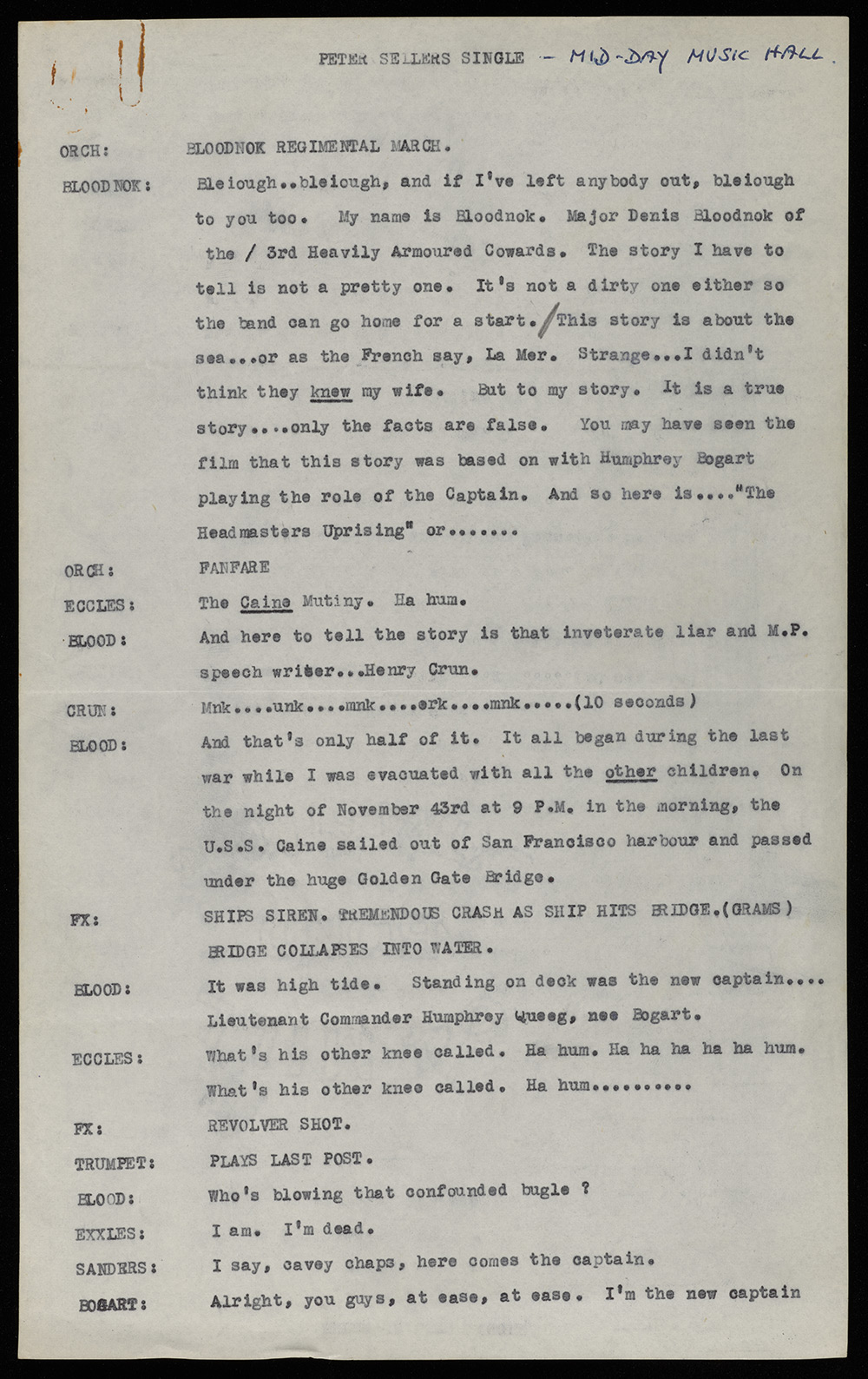 Previously unknown Goon Show material has been uncovered in the personal archive of legendary comedy writers Ray Galton and Alan Simpson, held at the University of York. The sketches were found in a folder marked ‘Peter Sellers Sketches’ and include script titles such as Sherlock Holmes, Cowboy Sketch, and Caine Mutiny. On closer inspection, the material – short, tightly written scripts likely no more than five minutes each – was clearly Goon Show content, written for Sellers to perform at his vocal best. These sketches aired as part of Midday Music Hall, a variety programme on the BBC Home Service between 16th – 30th October 1954. Sellers was billed as ‘resident top of the bill’ for three weeks. The material includes themes and voices typical of Sellers, and one joke even appears three years later in a Goon Show episode. The Midday Music Hall sketches were broadcast in the middle of the Goon Show’s fifth series, at a time when the series was at its creative peak. No episodes of Midday Music Hall are known to exist in the archive. The discovery opens up new avenues of research on collaborative writing practices at Associated London Scripts (ALS), the writers’ agency founded by Spike Milligan, Eric Sykes, Frankie Howerd, and Galton and Simpson. While it’s well known that ALS writers collaborated freely, this is the first tangible evidence suggesting Galton and Simpson may have directly contributed to Goon Show material. To celebrate, the University of York will restage one of the rediscovered sketches – The Case of the Missing Two Fingers, a Sherlock Holmes parody – at the York Festival of Ideas on 8 June. Actor Richard Usher will bring the material to life for the first time in over 70 years to a live audience, complete with period-accurate sound effects: https://yorkfestivalofideas.com/2025/calendar/hancock-steptoe The performance forms part of a wider campaign to secure and preserve the Galton and Simpson archive for future research, enjoyment, and appreciation, and the comedy community can help via donations to a special crowdfunding campaign at https://yustart.hubbub.net/p/galtonandsimpson Gary Brannan, Keeper of Archives and Research Collections at the University of York, said: “As a fan of both Galton and Simpson and the Goons, I can’t wait to share these unknown gems with the comedy community. Who knows what else we’ll find? That’s why it’s really important to make sure we save the archive for future fans to enjoy and to secure the legacy of Ray and Alan.”
